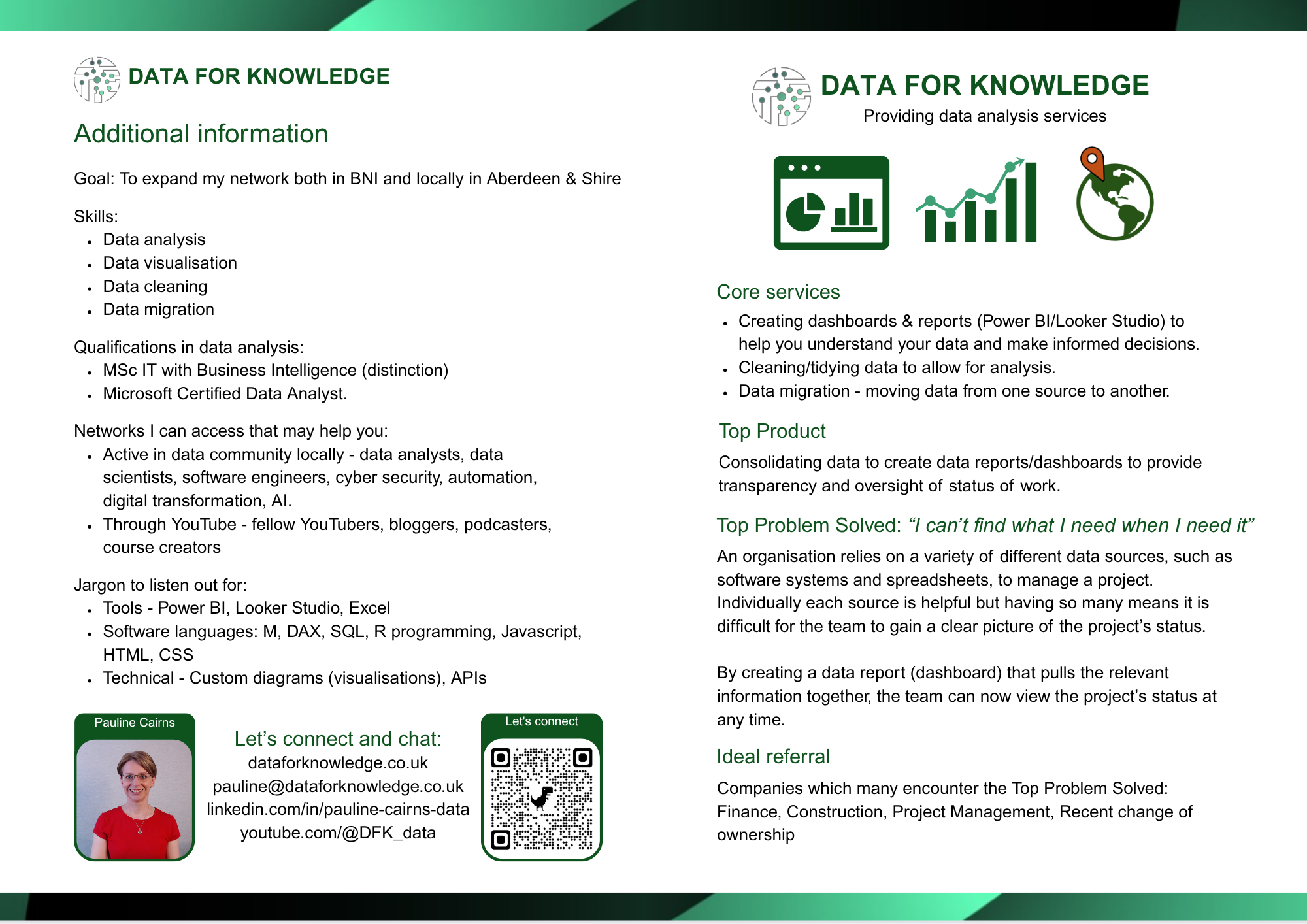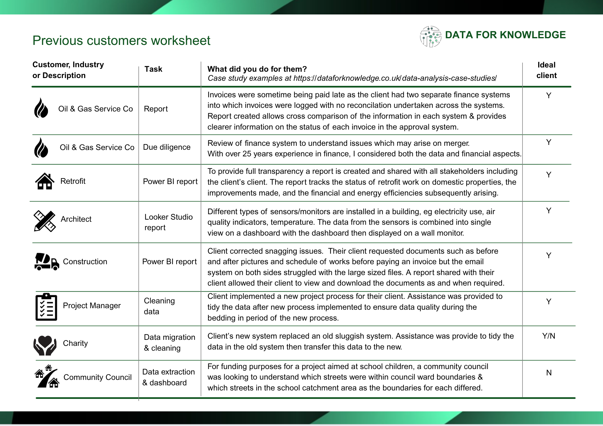 Example case studies can be found at https://dataforknowledge.co.uk/data-analysis-case-studies/